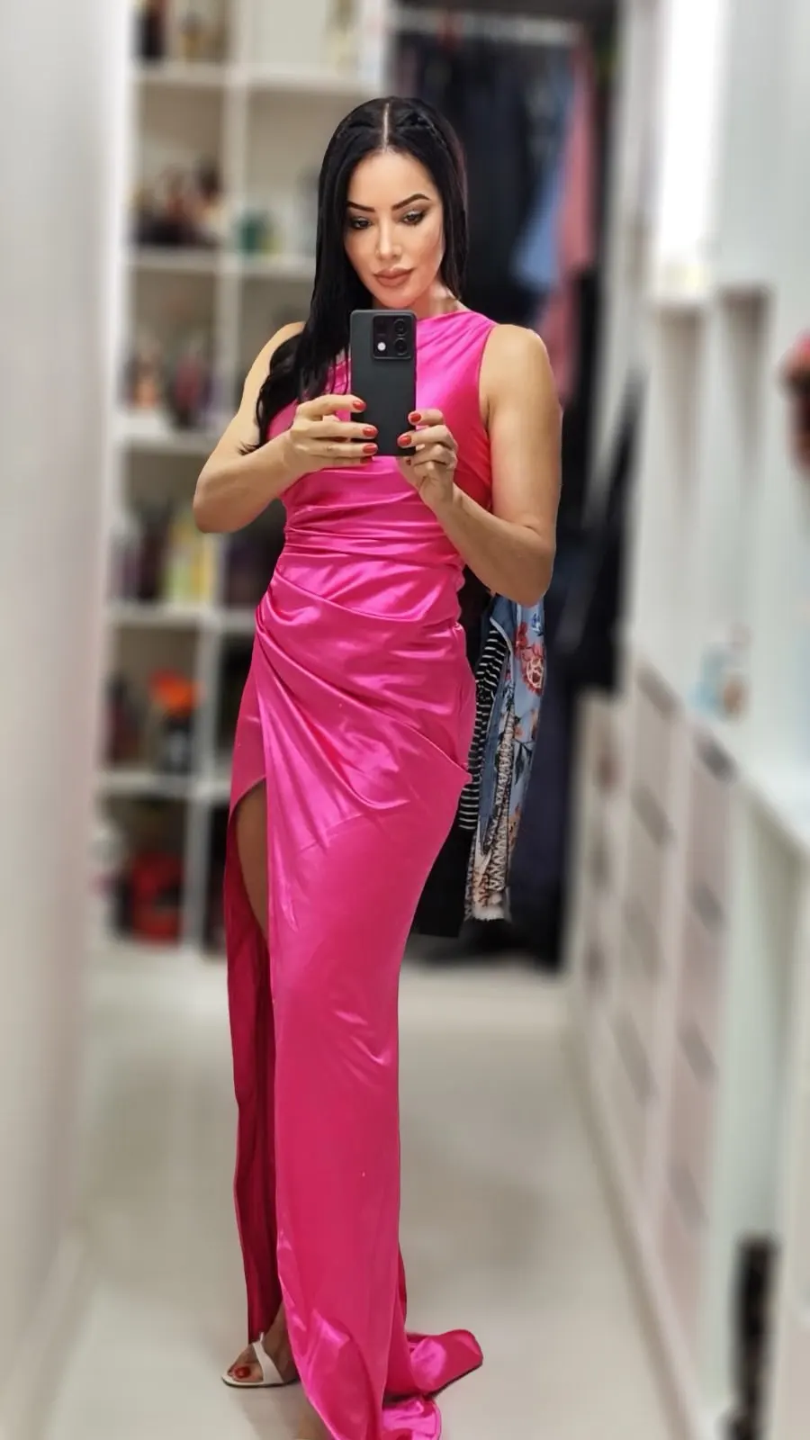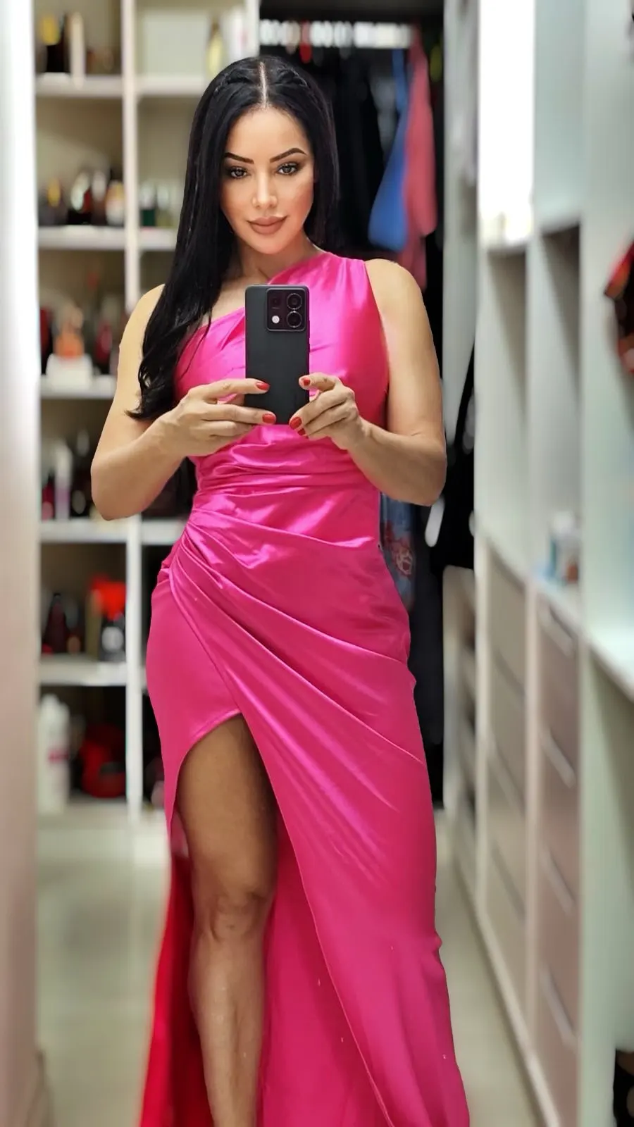 Sleek. Intentional. Unforgettable. The Ravyn Dress turns heads with its asymmetrical neckline, sculpted bodice, and thigh-high slit that flows with every step. Crafted from glossed polyester satin, it balances fluid elegance with bold edge — made for nights where you set the tone.